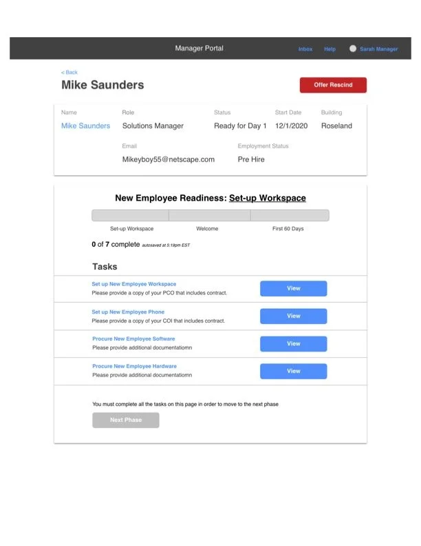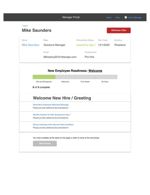 Before sprinting, I put together design concepts to align the team with where we wanted to be at the end of 12 sprints. This wireframe reflects the initial solution to consolidate information, give progress feedback, and create a cultural welcome.