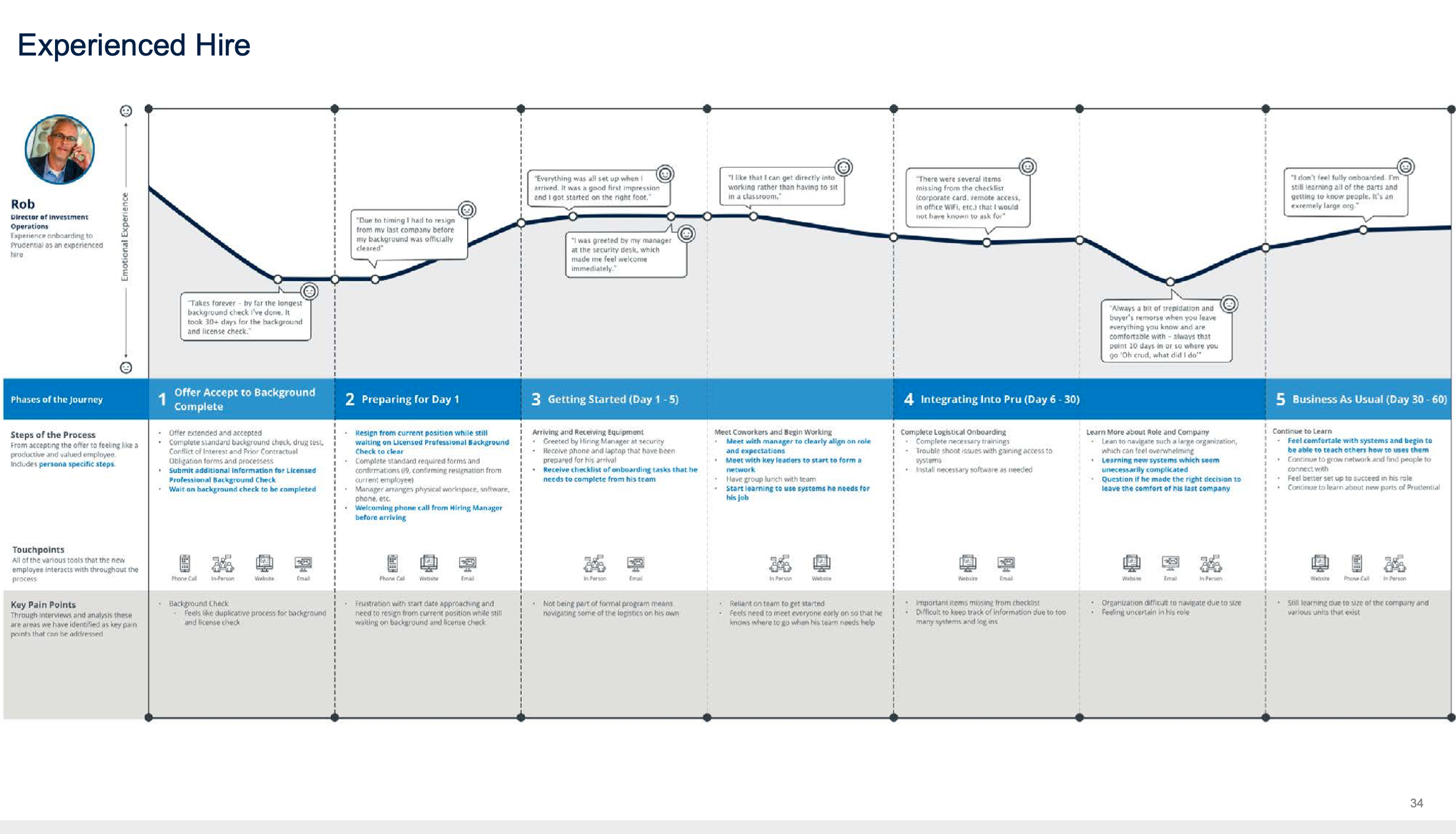 Through our interviews and data review, we identified several unique onboarding experiences: intern, call-center/cohort, experienced-hire, executive, and hiring manager.