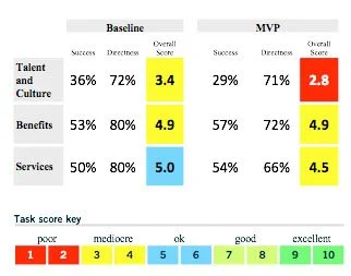 1. Neither old, nor proposed IA performed significantly better tha than the other. Across tasks in both Baseline and MVP, participants would explore multiple sections then go back. This shows low confidence in task answers.